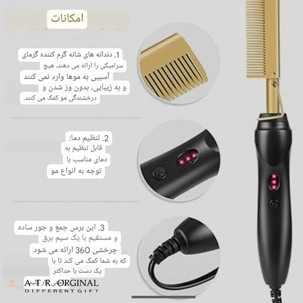 - بخش شانه حرارتی: این بخش با دندانهها یا شانههای حرارتی، به شما امکان میدهد موها را صاف کرده، آنها را از ریشه حجم دهید یا موجهای طبیعی و ملایمی در آنها ایجاد کنید. دندانههای شانه به گونهای طراحی شدهاند که به راحتی از میان موها عبور کرده و آنها را بدون کشیدگی و آسیب حالت میدهند.