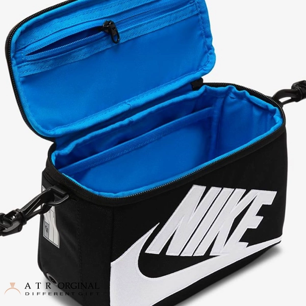 - این کیف دارای محل نگهداری جوراب، لوازم جانبی و توری اضافی است و شبیه جعبه کلاسیک نایک است. یک بند قابل تنظیم با یک دسته طنناب کشی جفت شده است تا حمل را آسان کند.